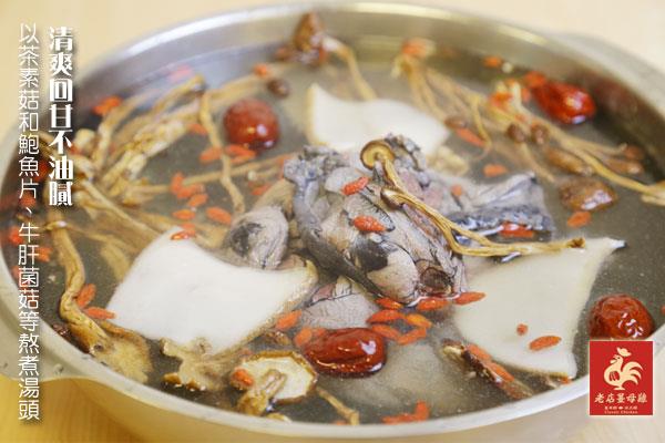 成份:烏骨雞、茶素菇、鮑魚片、紅棗、枸杞、高湯(水、雞骨)、調味料